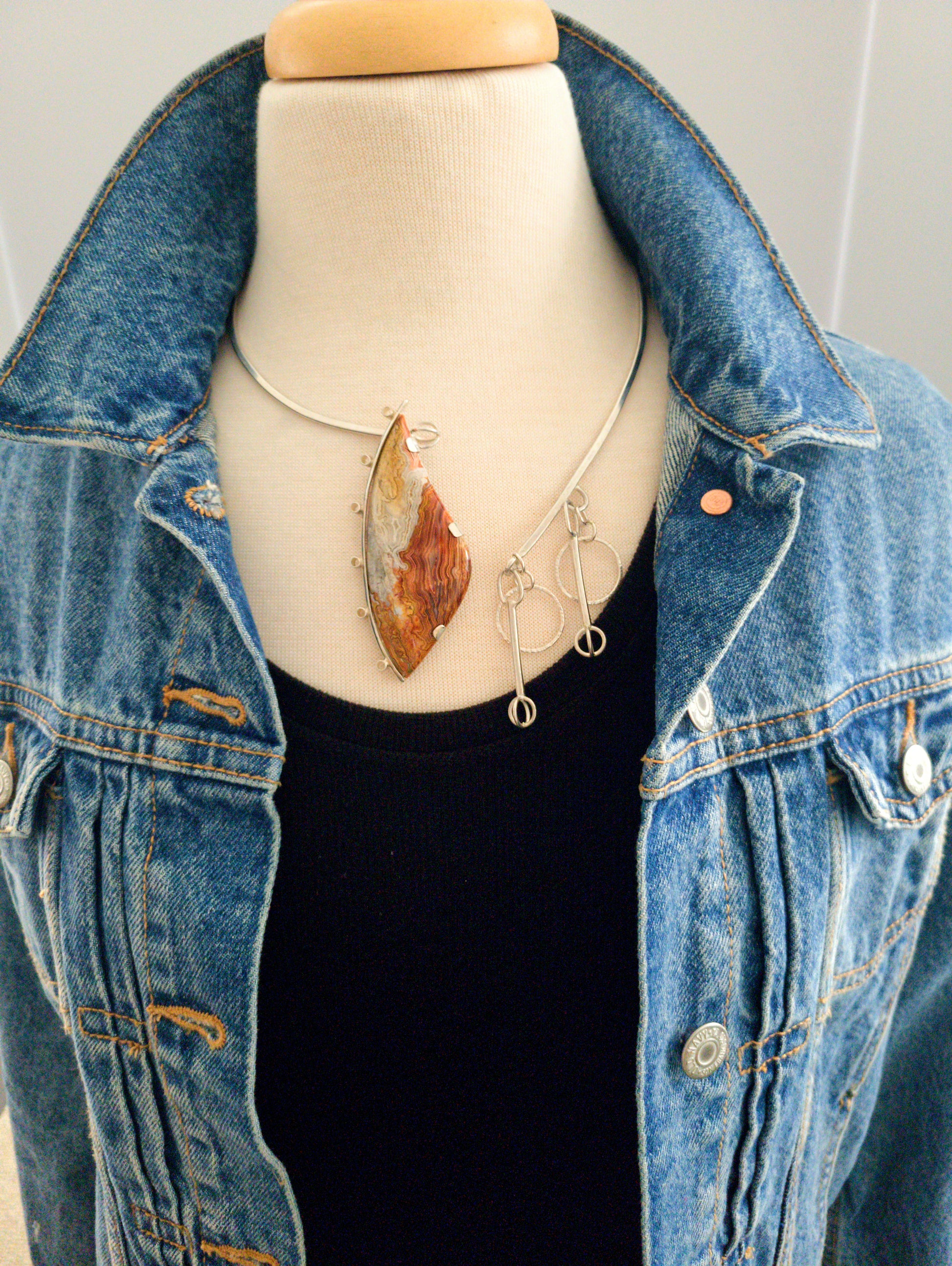 This beautiful collar necklace highlights this stunning Crazy Lace Agate stone.